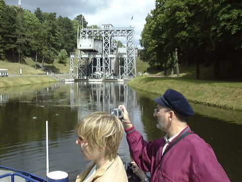Il battello è giunto poi, tramite una chiusa, al vecchio, glorioso e geniale ascensore idraulico, tuttora funzionante (considerato parte del patrimonio mondiale dall'Unesco).