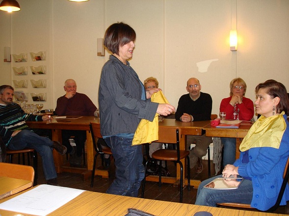 E' venuta da Liegi per parlarci dei colori. Anna Parisi, che gestisce un salone di parruccheria e di relooking nella "città ardente" è una professionista dei colori. Nel suo locale, la colorazione dei capelli è un elemento base del mestiere. E i colori, poi, sono una parte essenziale dell'apparenza di ciascuno. Ovviamente occorre rispettare, o meglio, far risaltare la personalità attraverso questi colori e gli stessi colori devono inserirsi in uno stile (taglio dei capelli, indumenti, accessori...). Di tutto questo ed altro ci ha intrattenuto la nostra ospite e, come si sa, un esempio pratico vale spesso molto di più di tante spiegazioni teoriche. Anna Parisi ha quindi voluto illustrare il suo discorso con alcuni simpatici test. Insomma, abbiamo vissuto una serata conviviale e partecipativa. Ringraziamo sentitamente Anna Parisi per aver accettato il nostro invito a Tournai. Un ringraziamento pure a Liliana Valerio che ha curato l'evento.