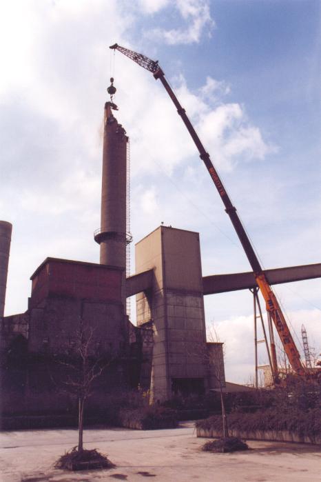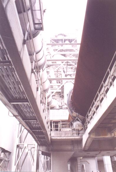 In cima alla torre di riscaldamento delle materie prime, sopra il forno di cottura del cemento. |