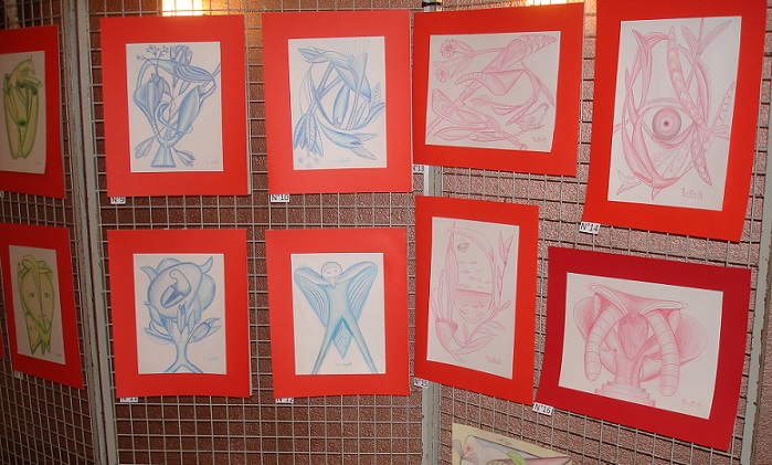 Fra qualche attimo inizierà la visita. Tutte le opere esposte sembrano più o meno uguali. Anche se c'è una tendenza o nelle linee del disegno o nei colori, e anche se si ritrovano alcuni dettagli ogni opera è unica e diversa. Questo è essenziale per me, spero lo sia anche per voi!